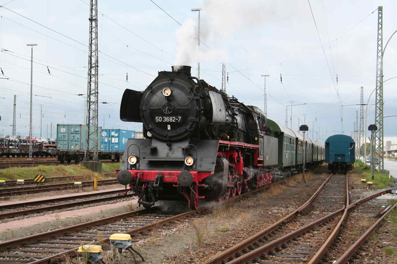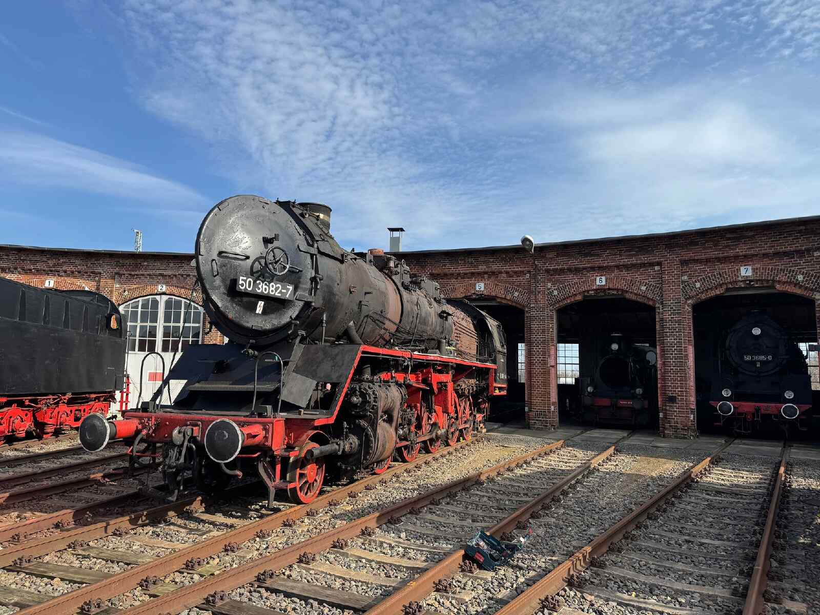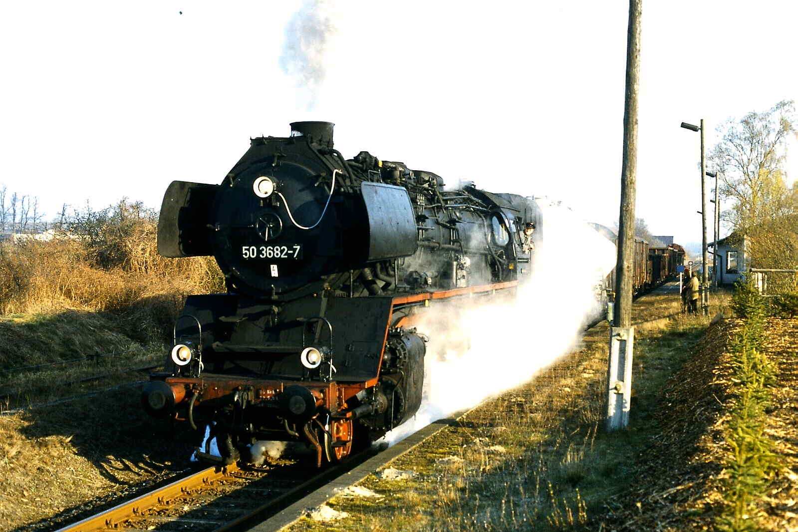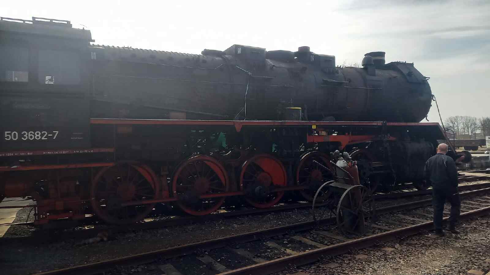 Our 50 3682, which was built by Krauss-Maffei in Munich in 1939 and put into service by the Deutsche Reichsbahn as 50 255, is one of the 208 locomotives mentioned above. It had an eventful life. From 1948 to 1952, it was used in what was known as column service. This involved transporting all kinds of machinery and goods claimed by the Soviet Union as reparations after the war to the Polish/Russian border, where they were transferred to Russian broad-gauge freight trains. Such journeys sometimes took weeks.