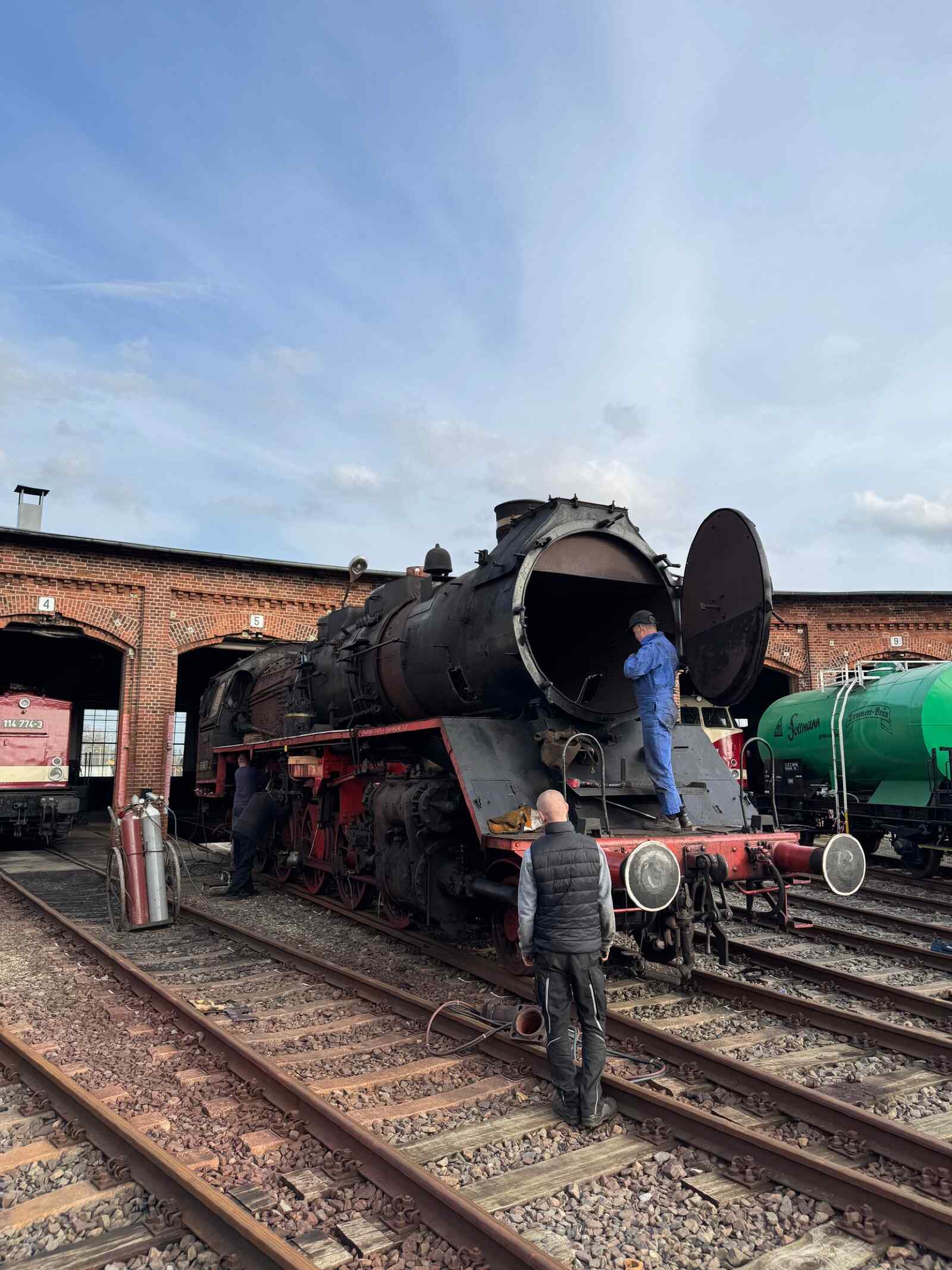 We'll keep that a secret for now which of our steam engines will be treated. In any case, before a new boiler can be installed on a locomotive, the old boiler and the driver's cab must first be removed. The latter covers the rear end of a locomotive boiler. In addition, various components have to be removed from a steam locomotive before a boiler can be lifted off. To manage expectations here as well: the whole process will not be completed within a few weeks, but will take a considerably longer period of time.