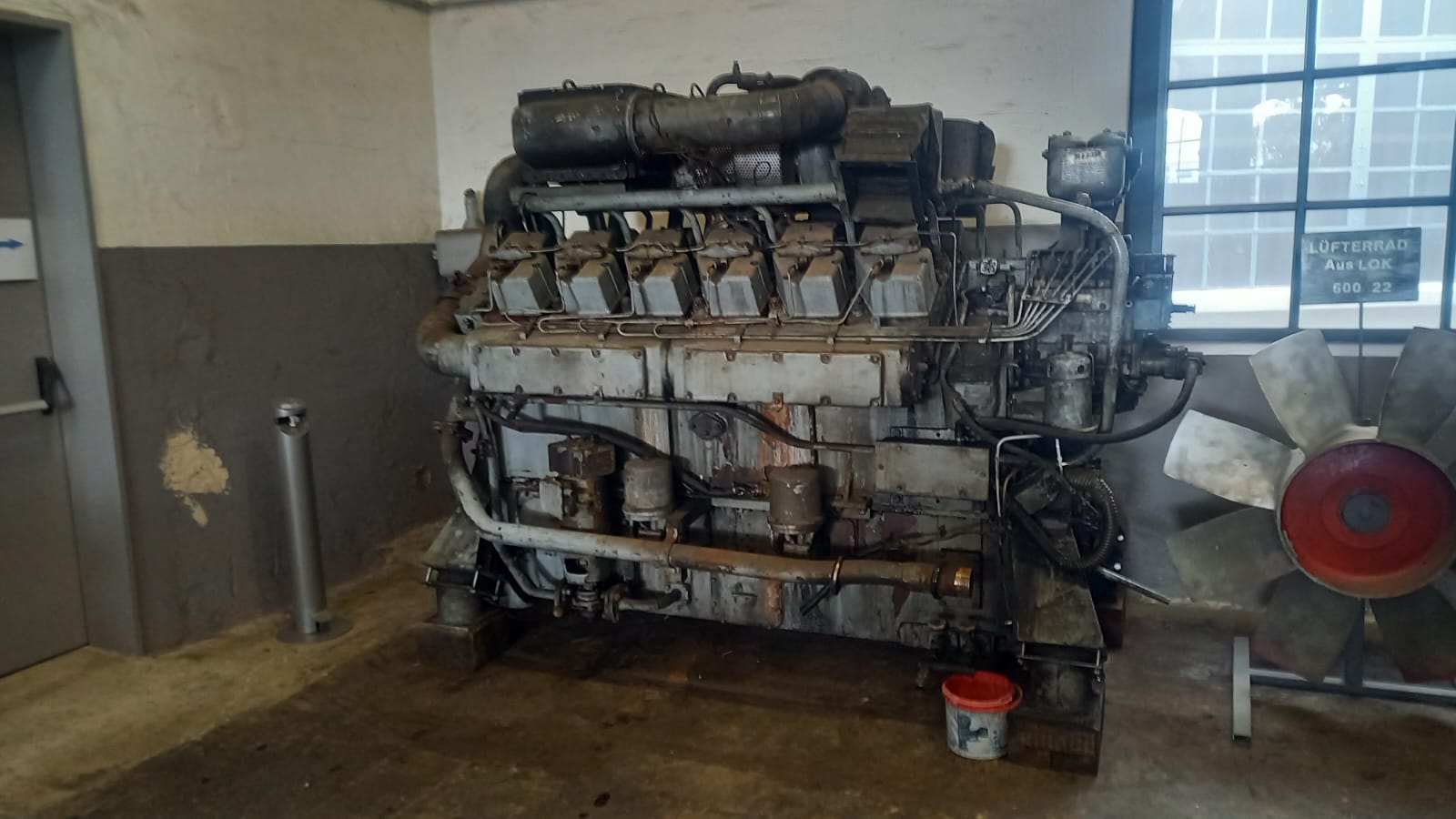 Incidentally, such an engine weighs several tonnes and is not easy to move without the necessary equipment. Fortunately, we now have a large forklift truck manufactured in the GDR at our disposal, which was previously used in the nearby sewing machine factory. For technology enthusiasts: it is a Takraf DFG6302/HG from 1977. It was built by VEB Verlade- und Transportanlagen Leipzig "Paul Fröhlich" and is powered by a diesel engine similar to those found in GDR W50 trucks.