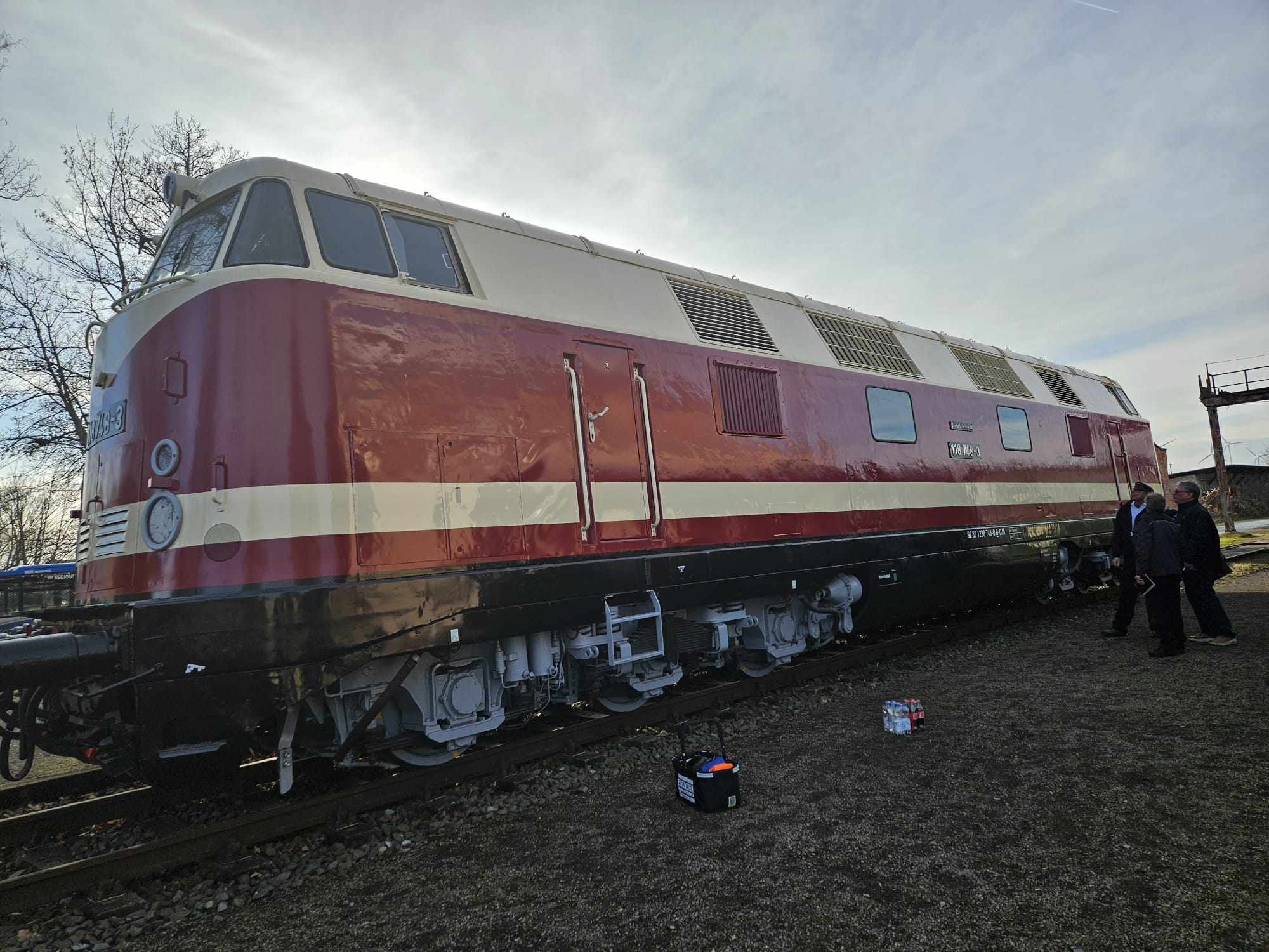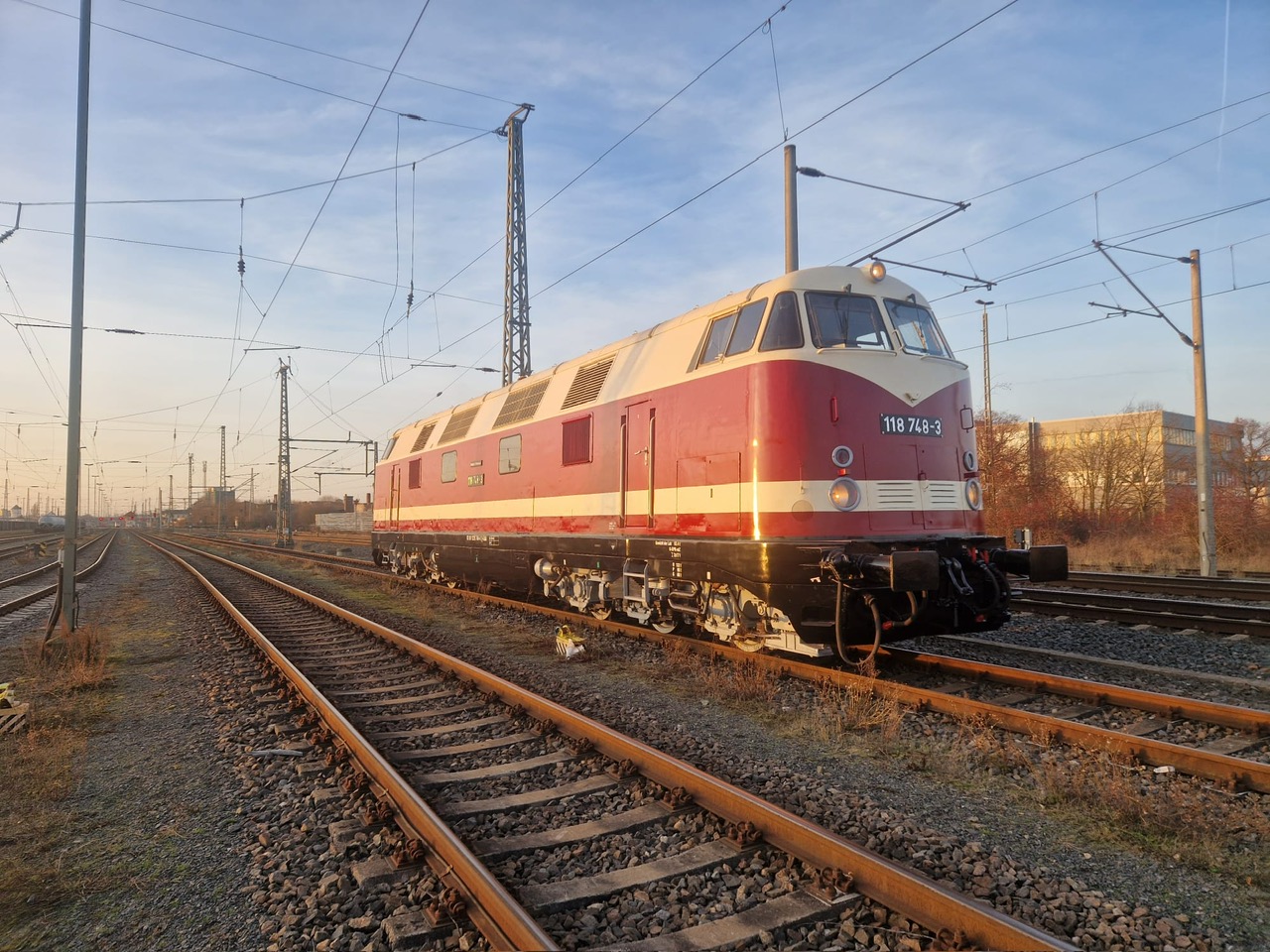 schon wieder ist ein Jahr vergangen und wir steuern auf Weihnachten und den Jahreswechsel zu. Natürlich denkt man dabei auch an Geschenke. Das tun wir auch. So freuen wir uns besonders über unser größtes Weihnachtsgeschenk dieses Jahr. Unsere Diesellok 118 748 ist nun wieder betriebsfähig. Ein paar Worte zu der Lok: Sie wurde 1968 bei beim VEB Lokomotivbau Karl Marx in Potsdam-Babelsberg gebaut, verfügt über zwei Dieselmotoren mit je 1.200 PS und darf maximal 120 km/h schnell fahren. Damit ist sie eine Universallok, die sowohl im Personen- als auch im Güterverkehr eingesetzt wurde. Nach ihrer Abstellung durch die Deutsche Bahn AG im Jahr 1999 wurde sie an die Mitteldeutsche Eisenbahn verkauft, die sie in 2020 an die Firma PRESS weitergab. Seitdem bereichert sie unsere Fahrzeugsammlung, bisher allerdings nur als funktionsfähiges Ausstellungsobjekt ohne Streckenzulassung. Im Jahr 2023 erwarb ein Mitglied unseres Vereins die Lok. In den letzten Monaten wurde sie grundlegend bei der Firma Malowa in Klostermansfeld am Ostrand des Harzes aufgearbeitet. Im Rahmen der Arbeiten wurden unter anderem die Motoren, Drehgestelle, Achsen und Bremsen instandgesetzt. Außerdem erhielt sie eine zeitgemäße Zugsicherungs- und Funkanlage, um sie auch für einen Einsatz auf Strecken der Deutschen Bahn AG zu ertüchtigen. Nach Abschluss der technischen Arbeiten hat sie in den letzten Tagen eine neue Lackierung erhalten hat und erstrahlt jetzt wieder im alten Glanz in rot/weißer Farbgebung. Die ersten beiden Fotos zeigen sie vor einigen Tagen noch in der Lackierhalle einer bekannten Eisenbahnwerkstatt in Klostermansfeld. Keine Angst, die schwarzen Streifen, die im Lack der Lok zu erkennen sind, reflektieren nur die Umgebung.
