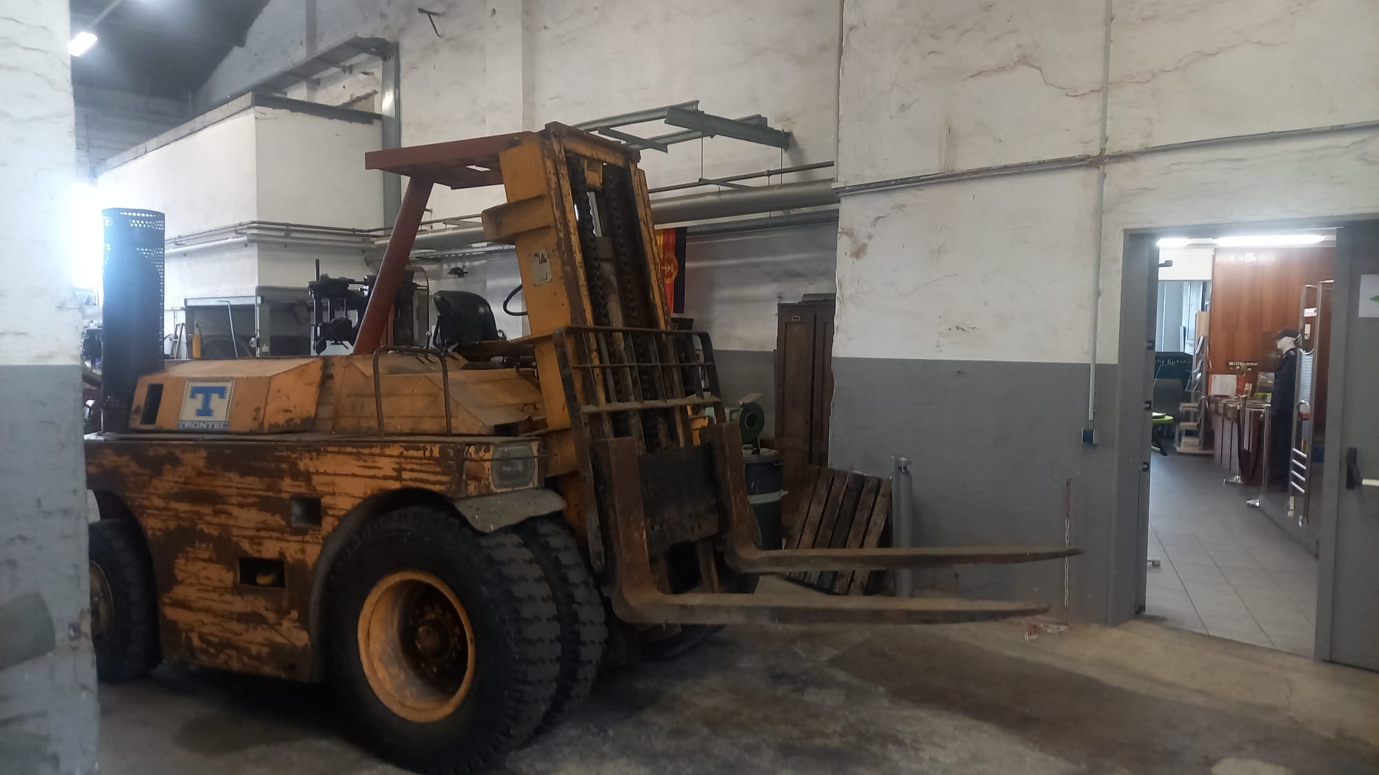 Damit ist einer unserer großen Träume wahrgeworden und wir danken allen Beteiligten sehr herzlich für ihre Großzügigkeit und Hingabe, ohne die das Projekt niemals möglich gewesen wäre. Wir wünschen der Lok allzeit gute Fahrt und Ihnen, liebe Freunde des Museums, mindestens ein Lächeln im Gesicht, wenn Sie die Lok demnächst in unserem Museum oder unterwegs sehen. Die Überführung war nun überhaupt nur möglich, weil die neue Gleiszufahrt zum Bahnbetriebswerk Wittenberge und damit auch zu unserem Museum soeben fertiggestellt wurde. Sie erinnern sich? Der Bahnhof Wittenberge wird derzeit dem erhöhten Verkehrsbedarf angepasst. Wir berichten darüber demnächst in einem gesonderten Newsletter. Ansonsten haben wir in Wittenberge die Zeit genutzt, um ein wenig im Lokschuppen und der Werkstatt umzuräumen. Wir hatten ja berichtet, dass wir zwei Ersatzmotoren für unsere beiden Dieselloks 118 748 und 114 774 erwerben konnten, die wir nun wettergeschützt im Lokschuppen untergebracht haben. Wenn Sie uns also in der nächsten Saison besuchen, können sie sie hier bestaunen. So ein Motor ist übrigens etliche Tonnen schwer und nicht so einfach zu bewegen, wenn man nicht über das notwendige Equipment verfügt. Zum Glück steht uns dafür nun ein großer Gabelstapler aus DDR-Produktion zur Verfügung, der früher im nahegelegenen Nähmaschinenwerk eingesetzt wurde. Für die Technikbegeisterten: Es handelt sich um einen Takraf DFG6302/HG aus dem Jahr 1977. Er wurde vom VEB Verlade- und Transportanlagen Leipzig "Paul Fröhlich" gebaut und wird von einem Dieselmotor angetrieben, wie man ihn auch aus DDR-LKWs der Bauart W50 kennt.